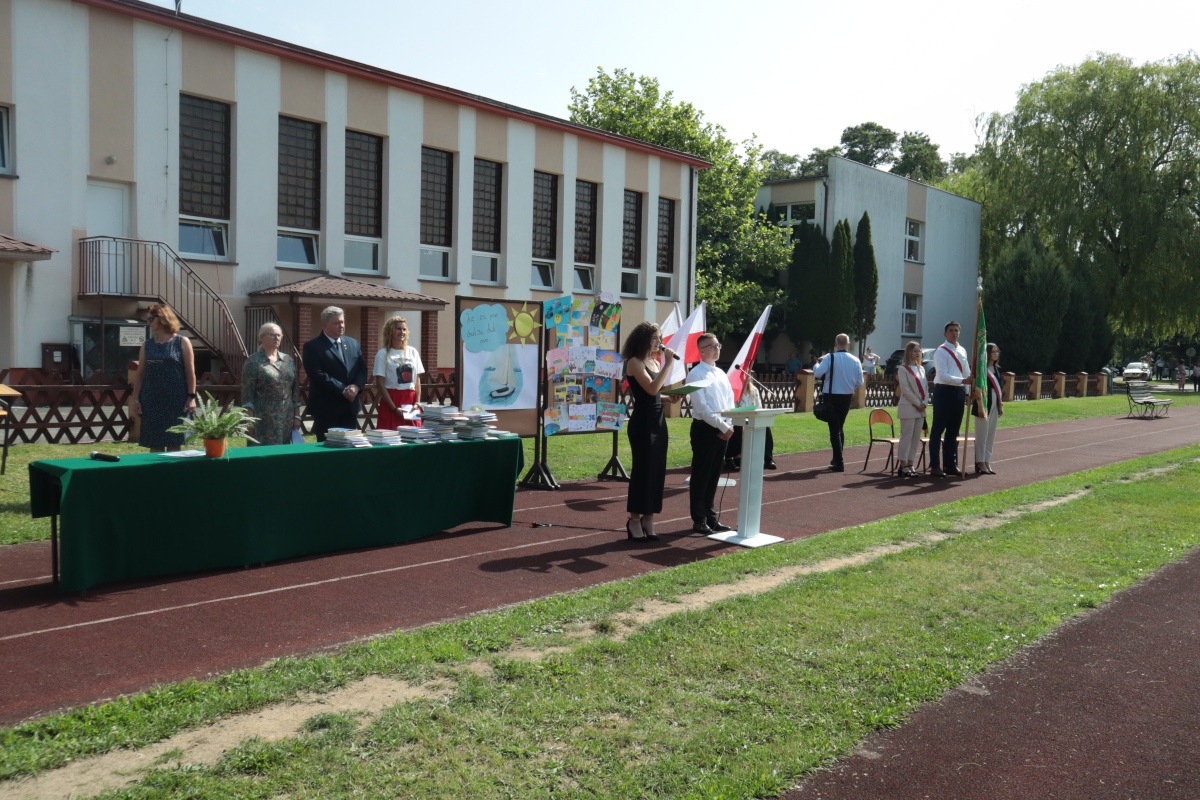 "Już za parę chwil, za chwil parę..." - taki cytat mogliśmy przeczytać na apelu kończącym rok szkolny 2023/24 w Powodowie. I rzeczywiście, prowadzący Zofia Heinrich i Patryk Malcher, bardzo szybko podsumowali 10 miesięcy. Wspominając obowiązek nauki, trudy zaliczeń i szkolne imprezy, podziękowali nauczycielom, rodzicom i sobie nawzajem.