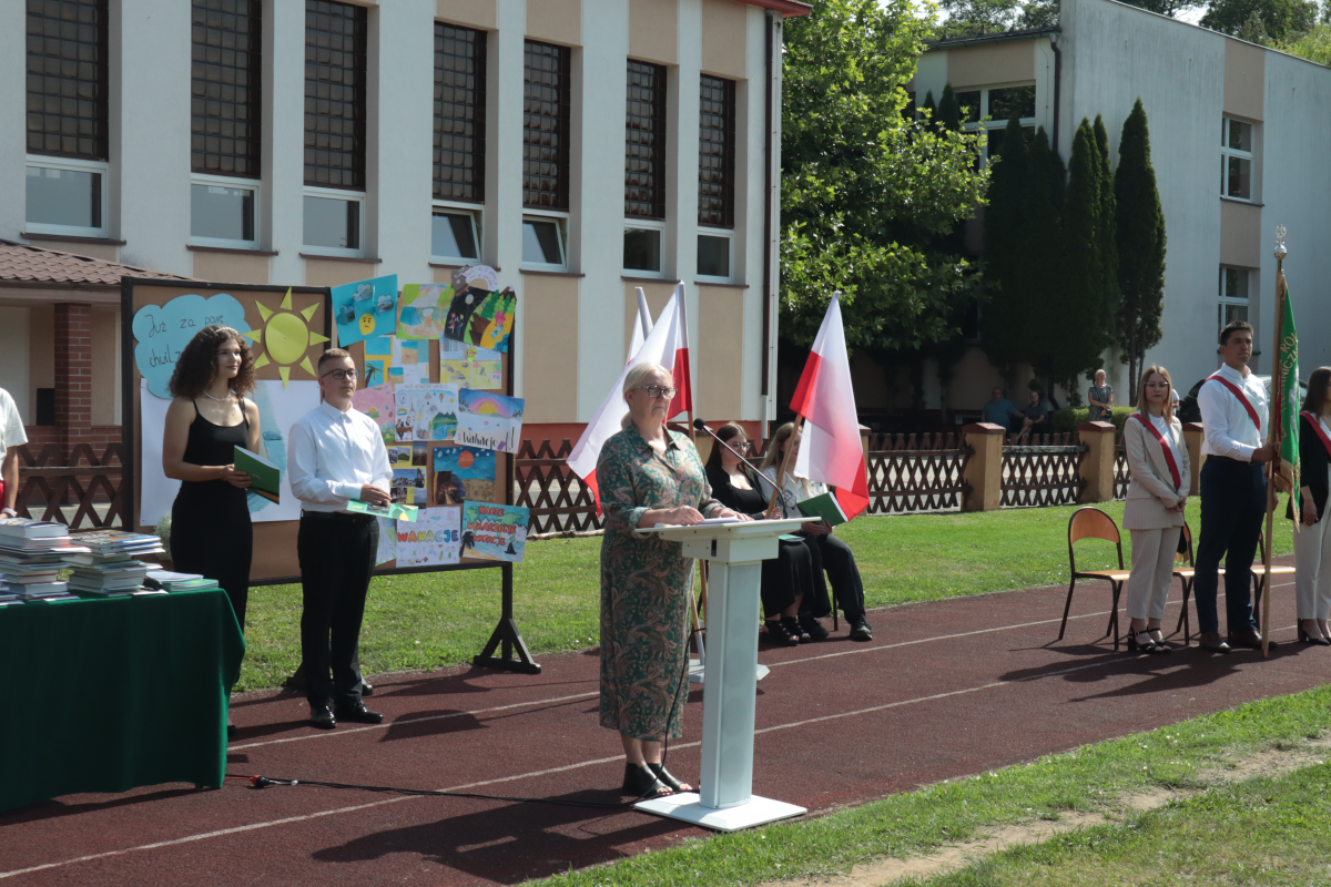 Apel zakończyła i wakacje ogłosiła pani dyrektor Alicja Golik, która w swoim wystąpieniu pochwaliła za każdy sukces, dopingowała do dalszej pracy od września i życzyła wszystkim udanego, bezpiecznego wypoczynku.
